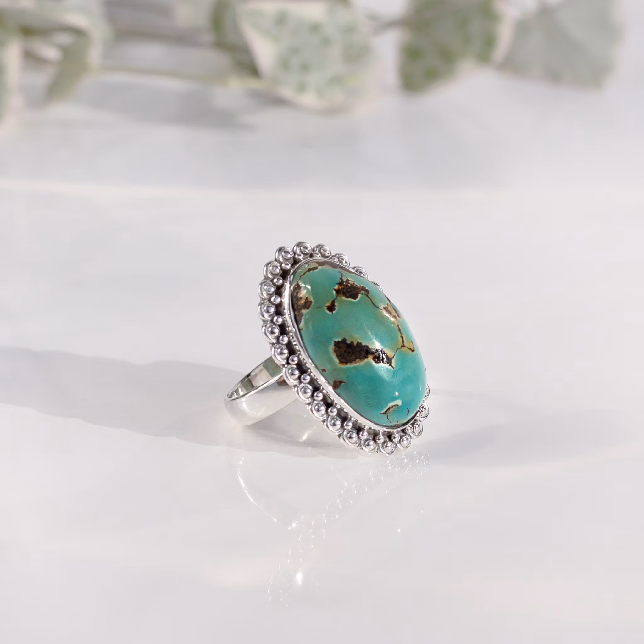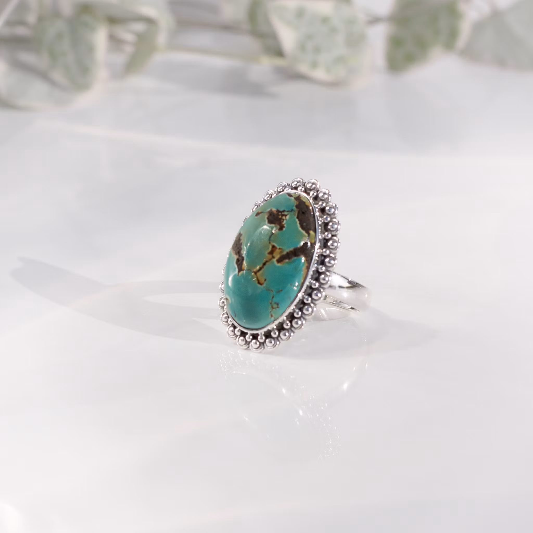 Ring i sterling silver med turkosTurkosen är väl känd för sina beskyddande egenskaper och används sedan länge som amulett, den sägs hålla oss i nära kontakt med