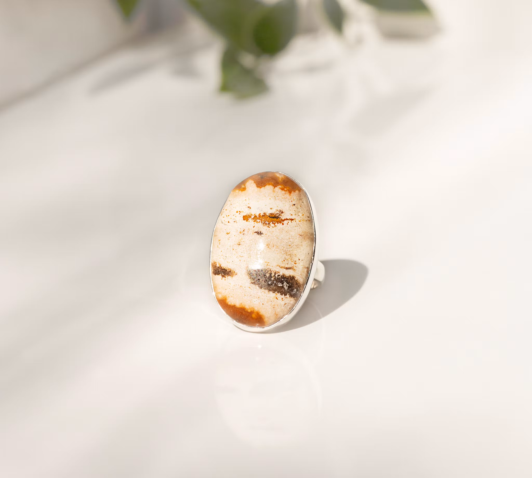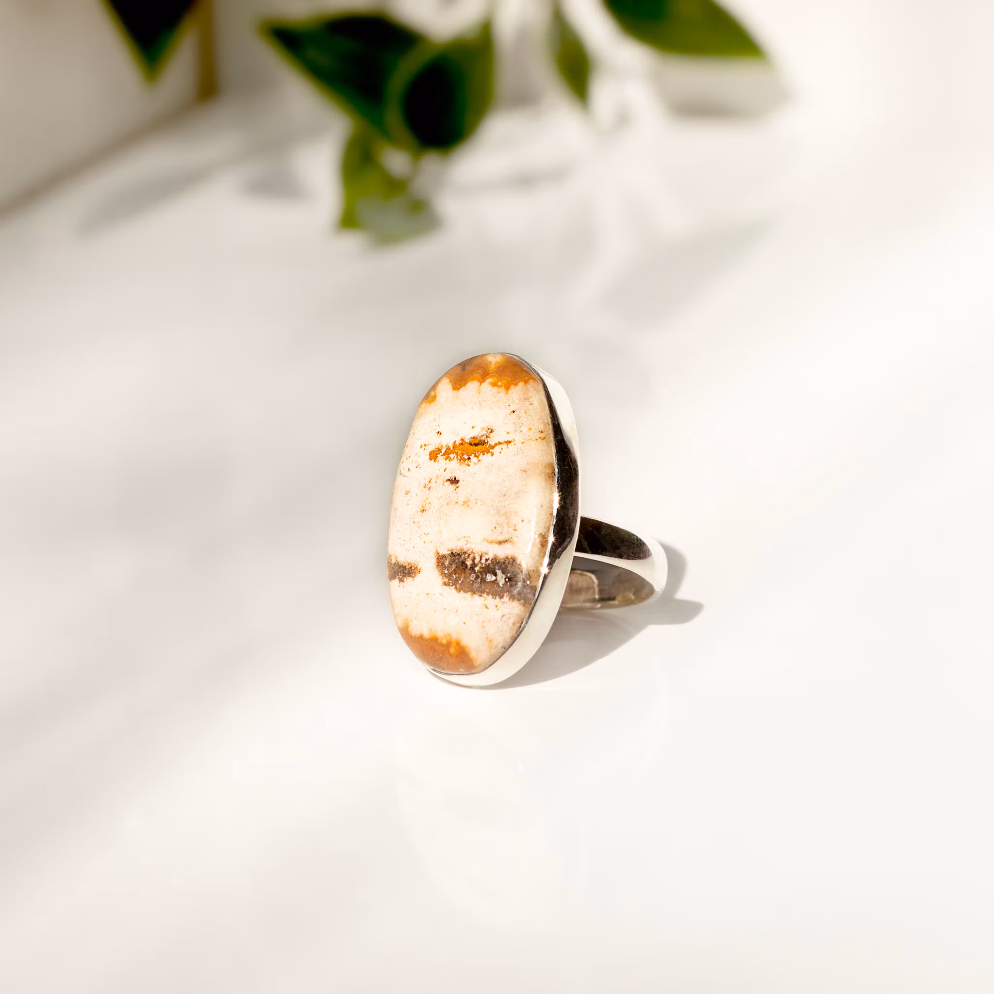 Ring i sterling silver (925) med jaspis. Storlek ring 18,1mm (eu size 57) storlek sten ca 19x28mm Jaspis sägs vara beskyddande och inbringa mod och styrka.