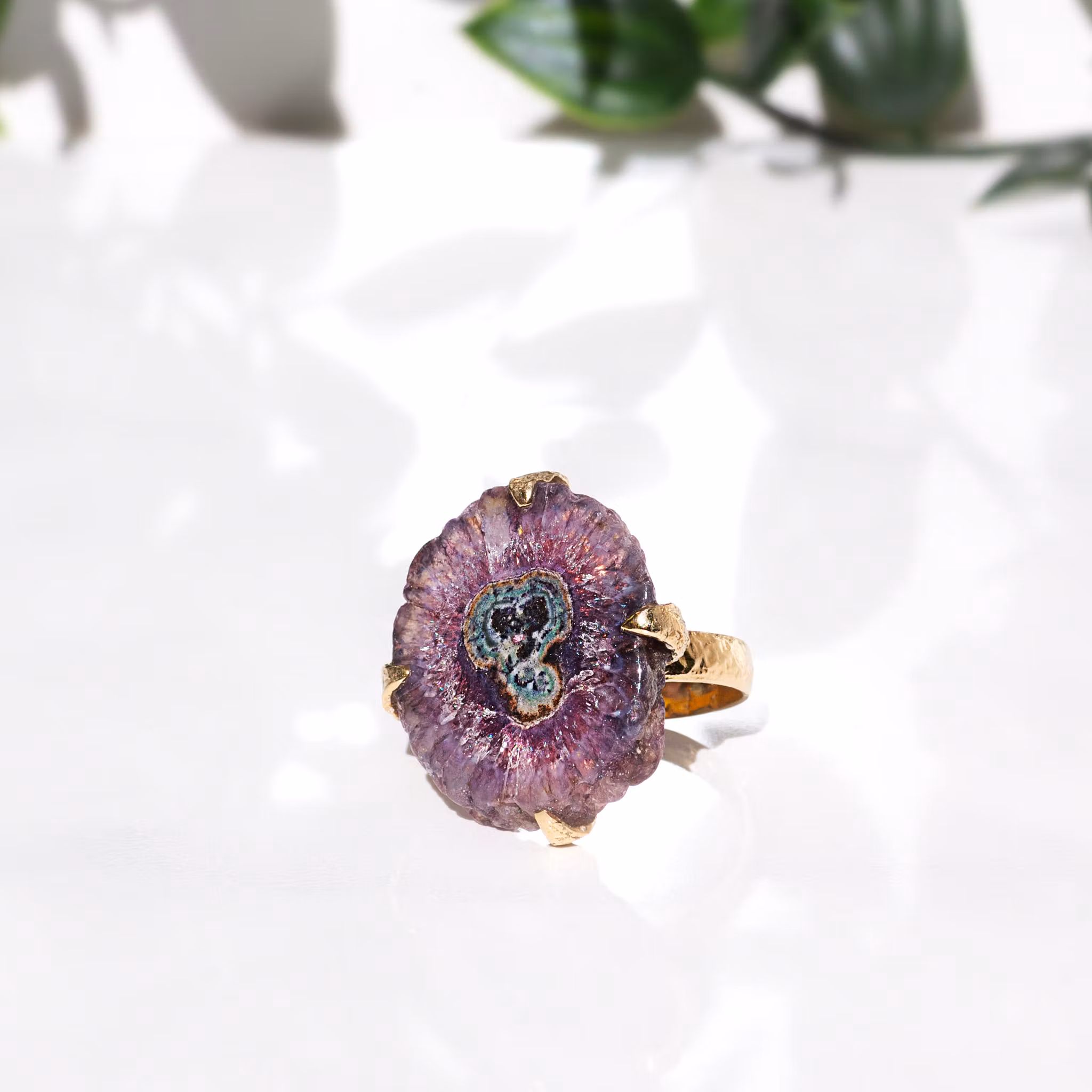 Ring i sterling silver (925) med 24 carat guldplätering (999) med ametiststalaktit. Storlek ring 18,5 mm (eu size 58) storlek sten ca 25 mmØ Ametisten sägs