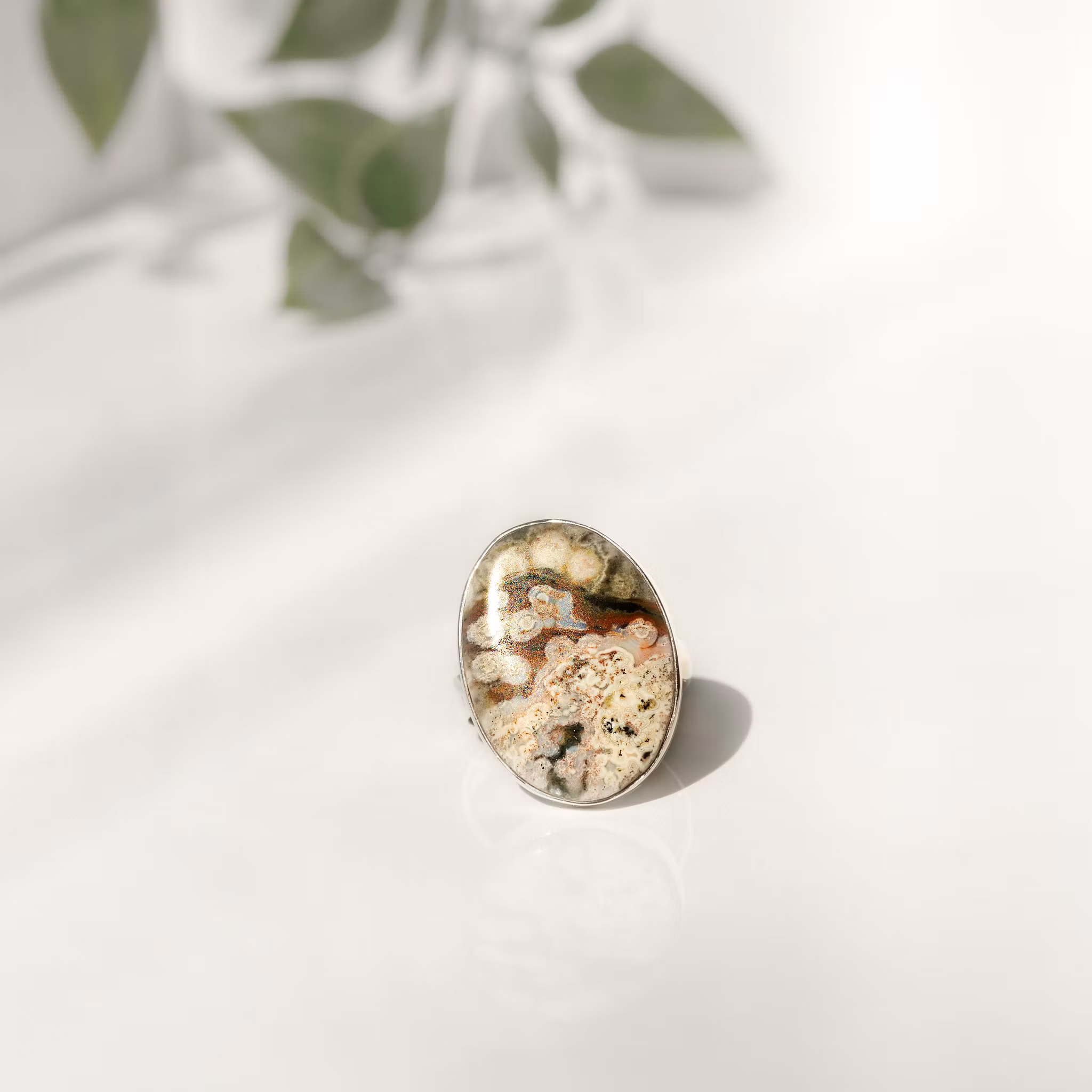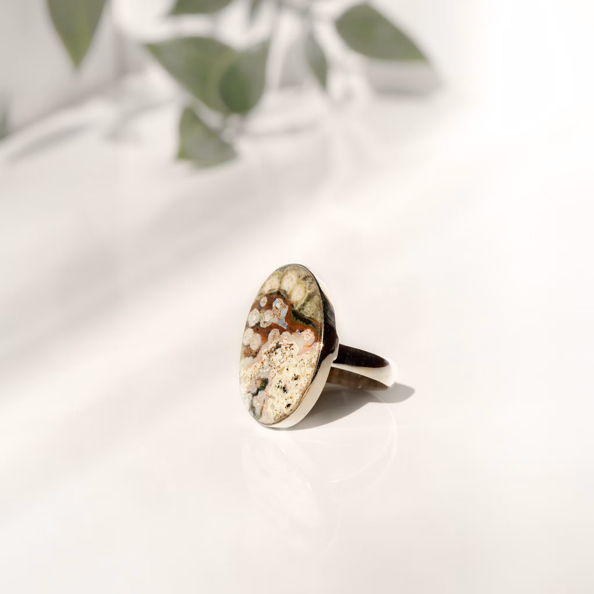 Ring I sterling silver (925) med ocean jasper. Storlek ring 18,5 mm (eu size 58). Storlek sten ca 18x24 mmOcean jaspis sägs stärka vår inre kraft, hjälpa att ko