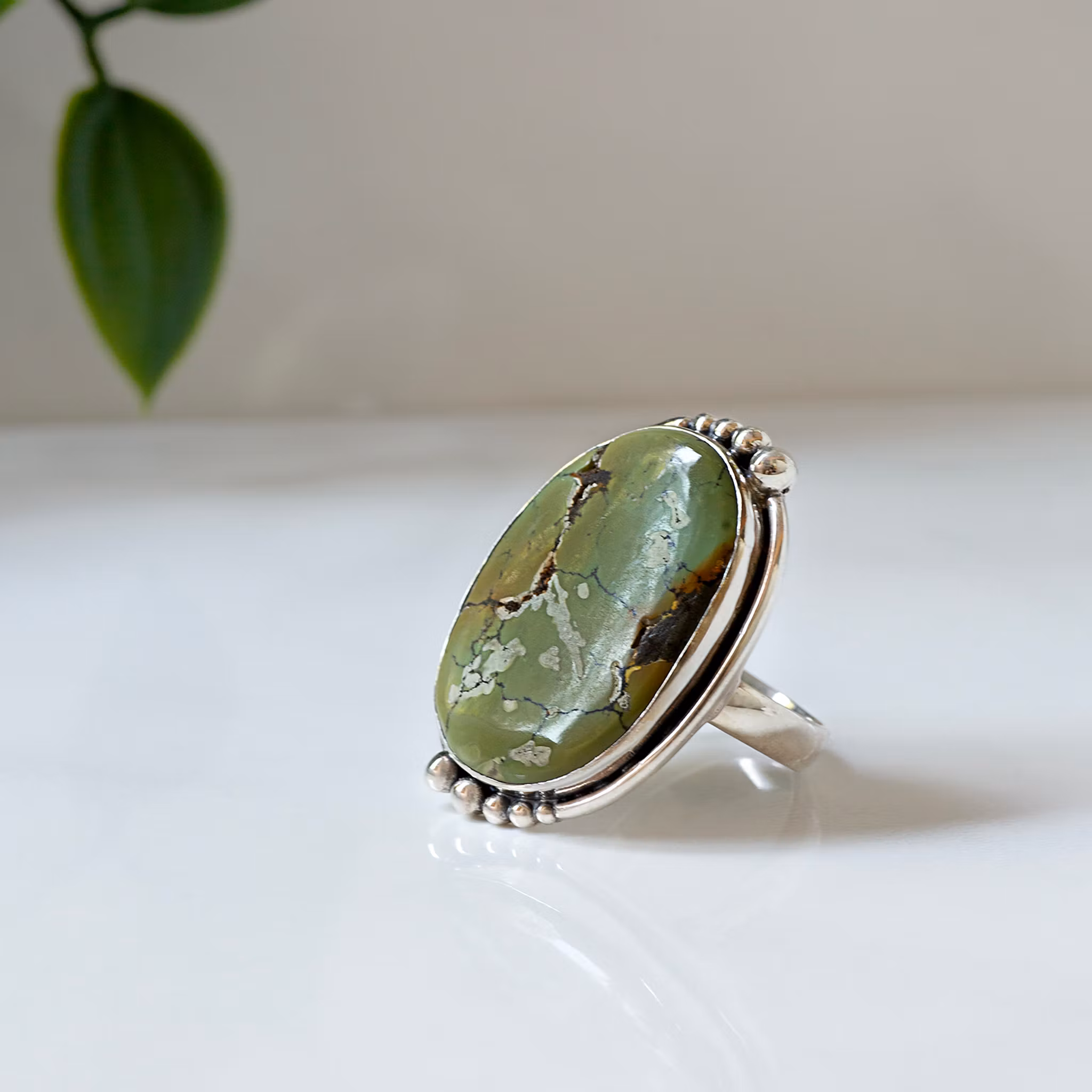Ring i sterling silver (925) med grön tibetansk turkos. Storlek ring 17,8 mm (eu size 56), storlek sten ca 21x29mm Turkosen är väl känd för sina beskyddand
