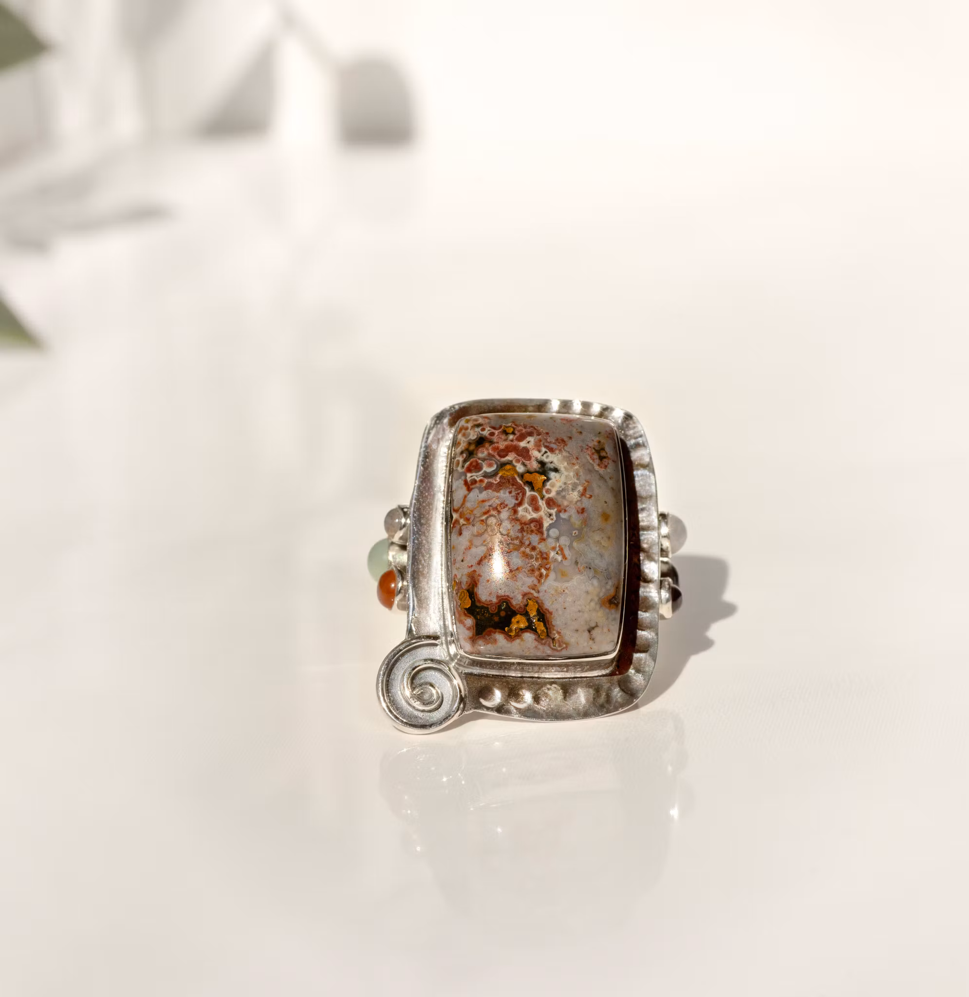 Ring i sterling silver (925) med spetsagat. Storlek ring 18,8mm (eu size 59) storlek sten ca 25x18mmOrange agat sägs vara en healingsten, lindrar stress o