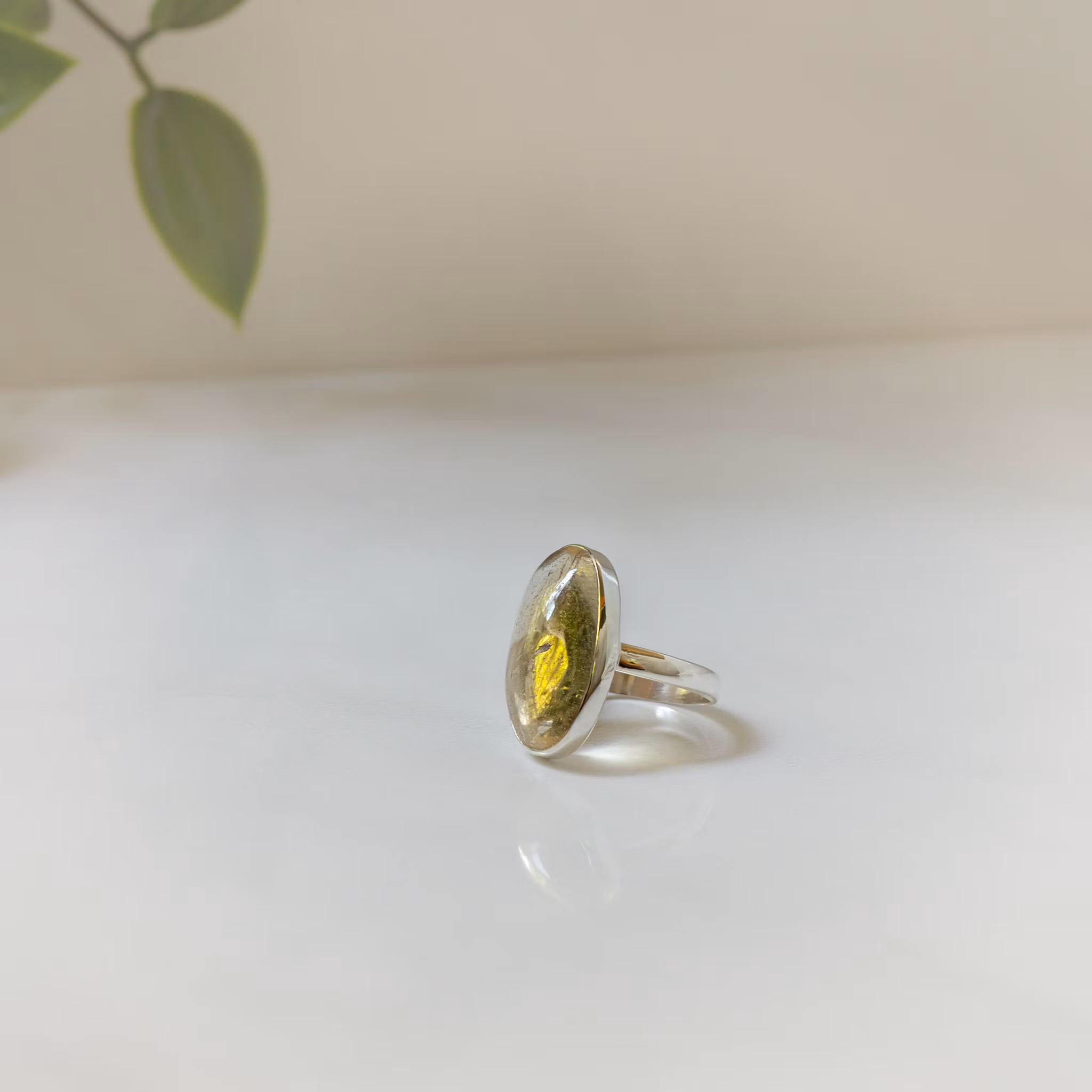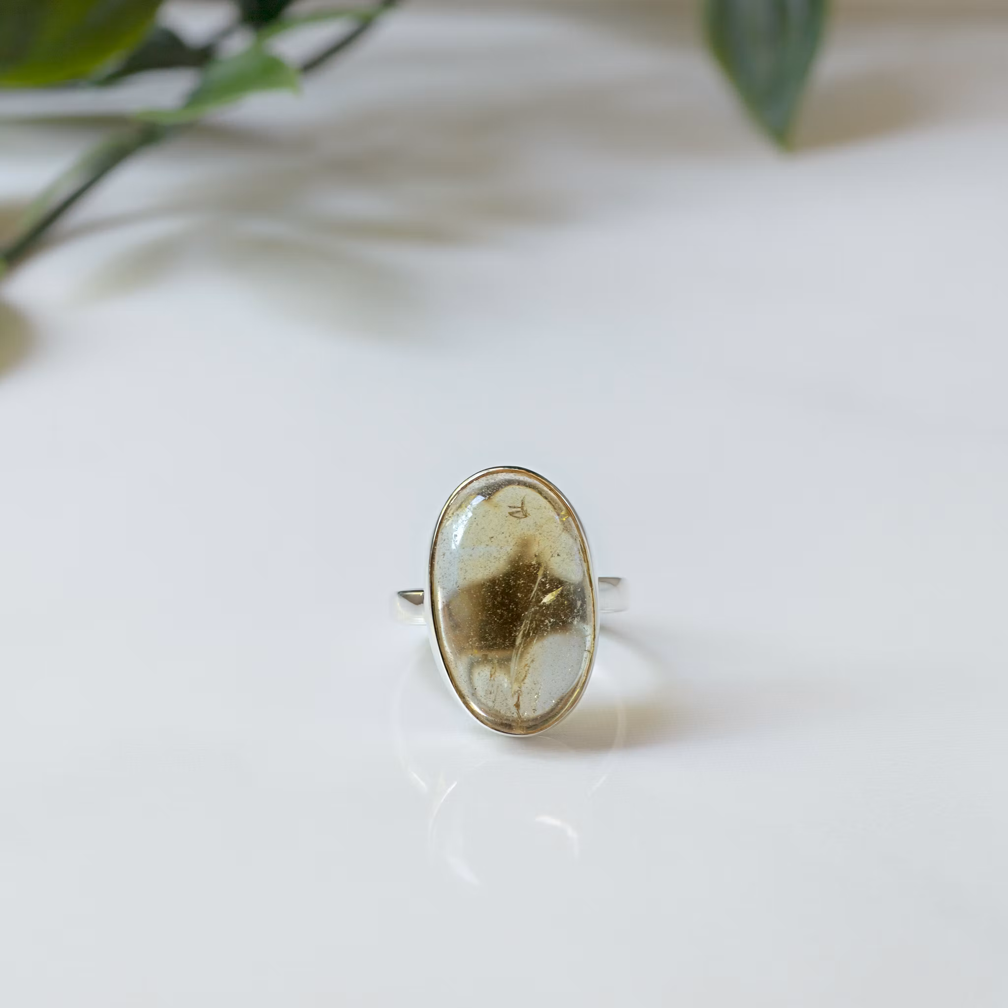 Ring i sterling silver (925) med citrin. Storlek ring 16,5 mm (eu size 52), storlek sten ca 8x20 mmCitrinen kallas även solens sten pga sin färg, den sägs stärk