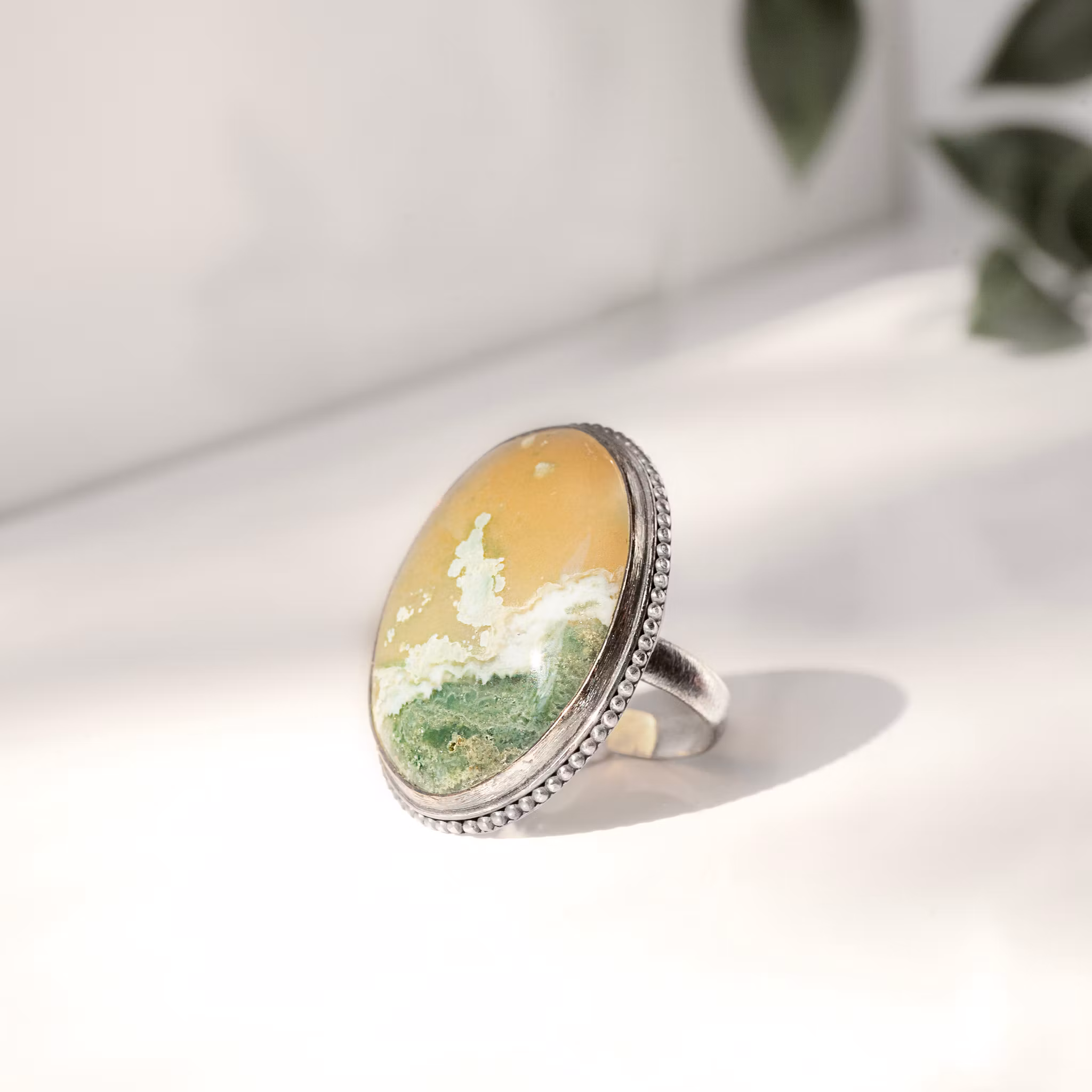 Ring i äkta silver med ocean jasper. Storlek ring 18,5mm (eu size 58) storlek sten ca 35x27mm Ocean jasper sägs stärka vår inre kraft, hjälpa att komma til