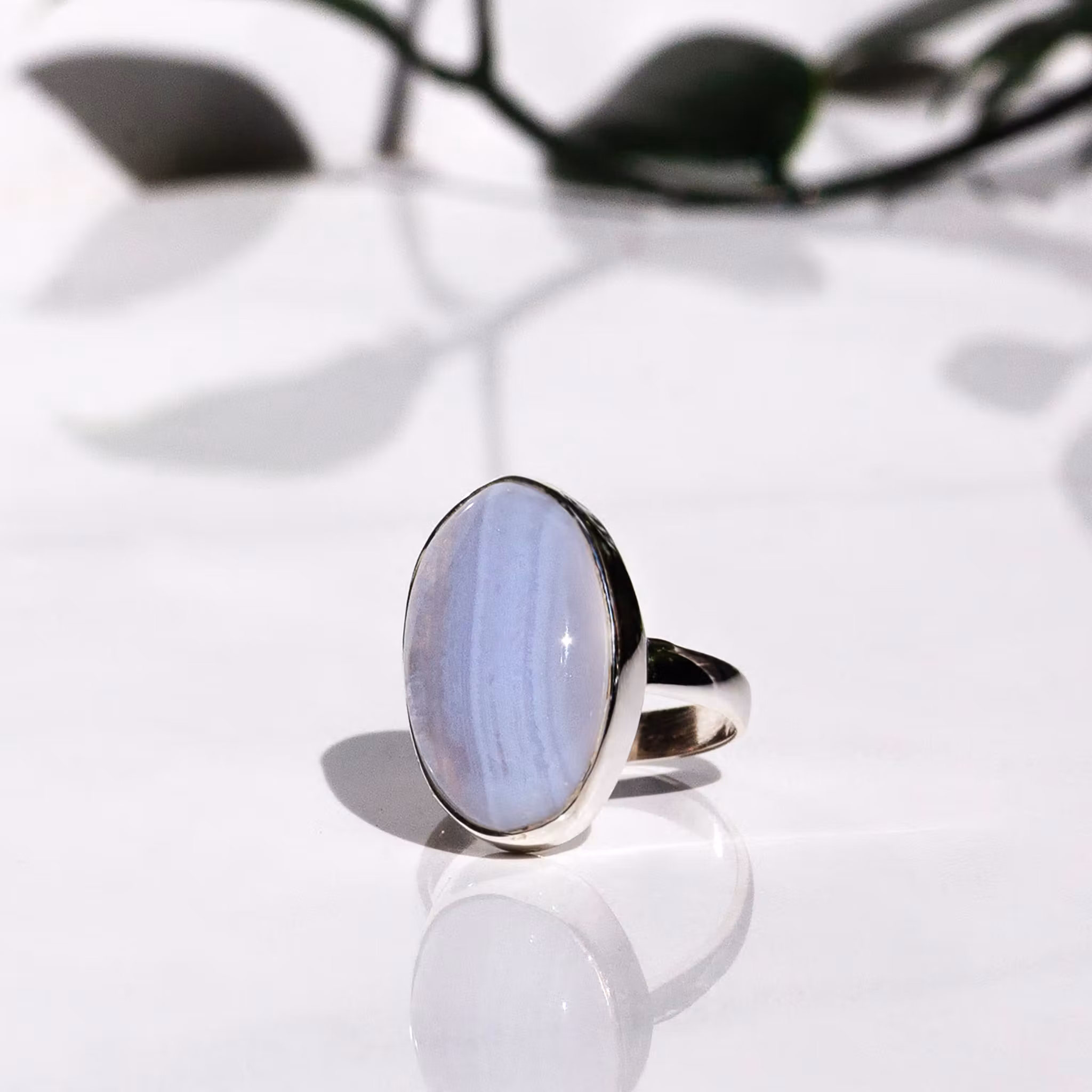 Ring i äkta silver med blå bandagat. Storlek ring 16,2mm (eu size 51) storlek sten 8x18mmBlå bandagat sägs frigöra energier och väcka den inre andligheten, den