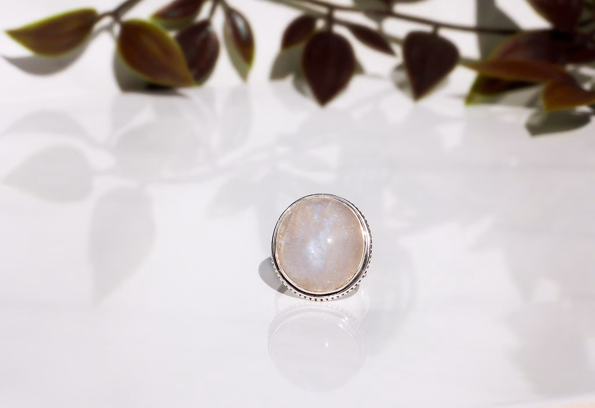 Ring i sterling silver (925) med månsten. Storlek ring 18,5 mm (eu size 58), storlek sten ca 19mmØMånstenen sägs bringa tur och skydd, den skimrande stenen refl